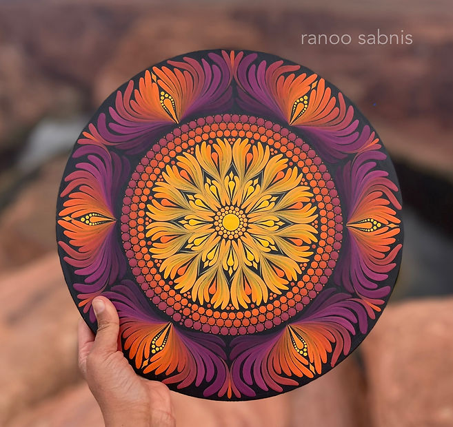 I've been painting mandalas since 2022 - and I began with a basic dotting tool set gifted to me by my sister. Since then, I've taken inspiration from other artists and have developed my own style including sweeping brushstrokes and beautiful color gradients.